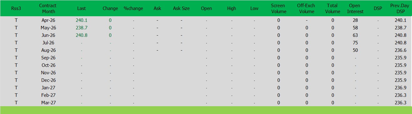 ราคาปิดตลาดยาง SICOMประจำวัน จันทร์ ที่ 30มีนาคม2569ราคายาง RSS3 ราคาเดือนเม.ย. ราคาลดลง 0เซนต์สหรัฐ ปิดที่ 240.1 เซนต์สหรัฐ