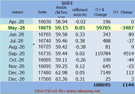 เทียบจากราคา(Settle)คิดเป็นเงินไทย(หักค่าใช้จ่าย)59.15บาท/กก. ราคาเพิ่มขึ้น 0.05บาท/กก.