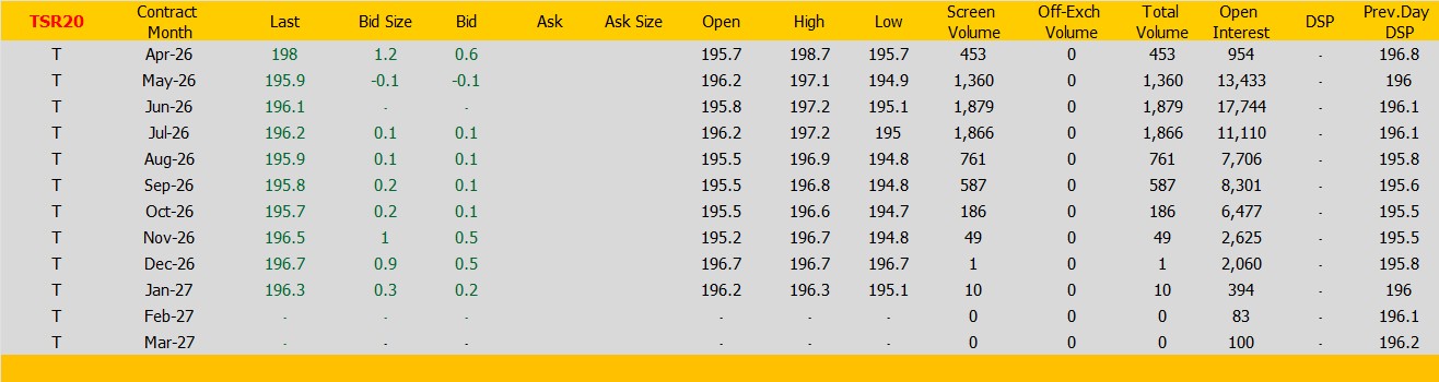 งTSR20 ตลาดยางSICOM ราคาส่งมอบเดือน เม.ย.ปิดที่198 เซนต์สหรัฐ ราคาเพิ่มขึ้น 1.2 เซนต์สหรัฐหรือ คิดเป็นเปอร์เซนต์ +0.61% %