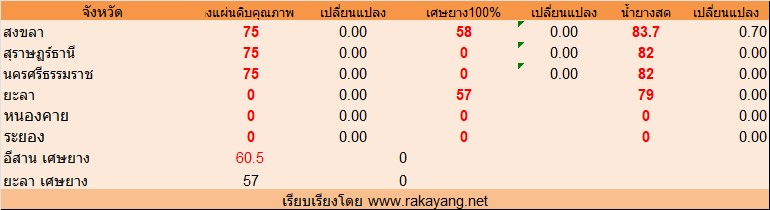 จังหวัด สงขลา ยางแผ่นดิบคุณภาพ 3  = 75บาท/กก. ราคาไม่เปลี่ยนแปลง เศษยาง 58บาท/กก. ราคาไม่เปลี่ยนแปลง  บาท/กก. น้ำยางสด ราคา ณ โรงงาน 83.7บาท/กก. ราคาเพิ่มขึ้น 0.70บาท